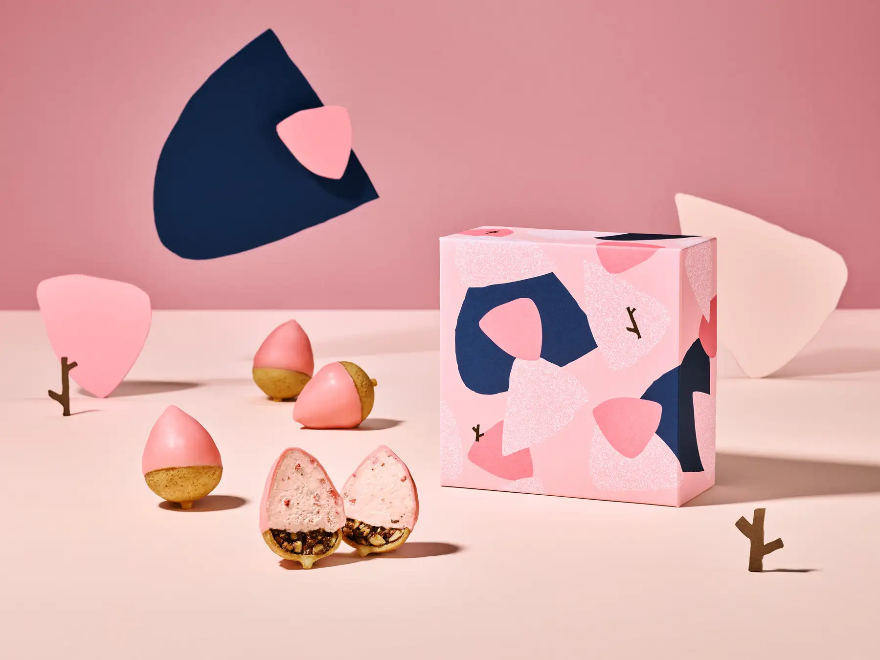森の木々を連想させるフォルムとサクサク食感が魅力の「森ノ木」シリーズからは、北海道産のフリーズドライイチゴを組み合わせたバレンタインらしいフレーバー「森ノ木 赤」(8本入、1,512円)もラインナップされます。爽やかな酸味と風味にこだわった北海道産のフリーズドライイチゴに、サクサク食感のピンク色のフィアンティーヌ、ホワイトクランチクッキー、ローストアーモンドを混ぜこみ、バランスの良い食感とホワイトチョコレートのやさしい甘みが調和する、見た目も楽しいクリスピーストロベリーチョコレートです。